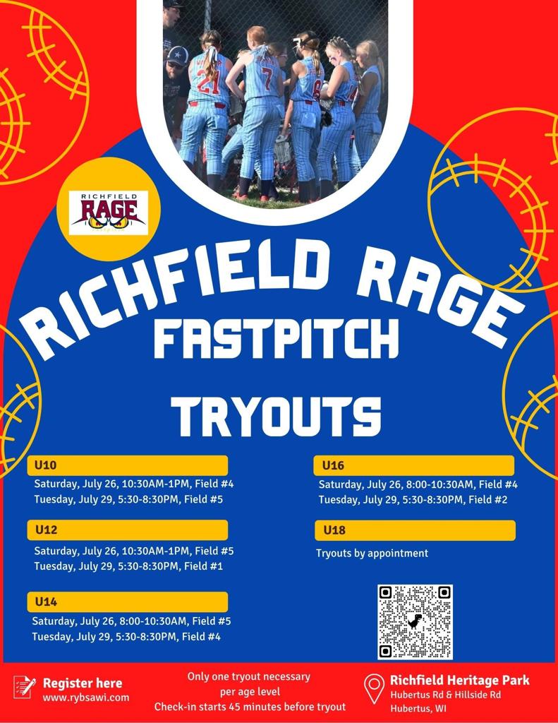 Richfield RAGE Fastpitch is part of the RYBSA organization and is comprised of competitive league and travel teams. These players try-out for their respective team at the end of the summer. Individual teams can choose to practice and compete in the Fall and early Winter, but the season officially starts the next year and each Fastpitch team chooses a league to play in and they also play in 2 to 4 tournaments a year. New for the 2025 season, all Fastpitch teams will be using the USA Softball age requirements and our home tournaments will be using USA Softball age requirements as well.